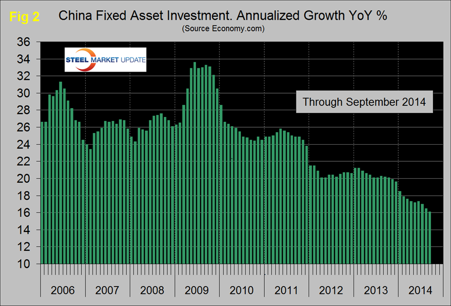 Figure 2 shows the growth of fixed asset investment y/y. The decline experienced in 2013 has accelerated through the first three quarters of 2014. We understand that this data includes real-estate purchases so is not a direct reflection of constructional steel demand. We are assuming that the steel on the ground portion of this data follows the overall trend and this is in line with the stated objective to rebalance the economy in favor of consumer consumption.