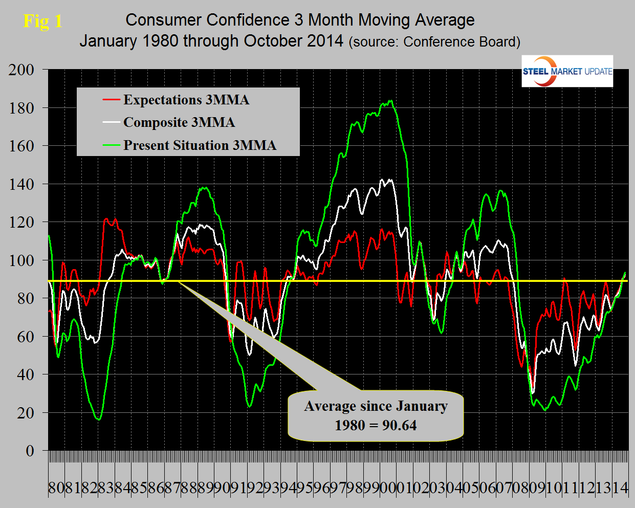 The consumer confidence index as reported by the Conference Board bounced back in October and the dismal September results were revised upwards. The composite rose from 89.0 (first reported as 86.0) to 94.9, the view of the present situation rose from 93.0 (first reported as 89.4) to 93.7 as expectations rose from 86.4 (first reported as 83.7) to 95.0. Which just goes to prove that first estimates should be treated with caution and that a three month moving average, (3MMA) is a much better guide to a true situation. On closer examination it looks as though the September view of expectations was an outlier. After revision the September view of the present situation came back in line. The 3MMA of the composite, the view of the present situation and expectations are shown in Figure 1. The present situation component has been much more volatile that expectations since our data began 34 years ago. History suggests that we are now entering a period when the view of the present situation will move ahead of expectations.
