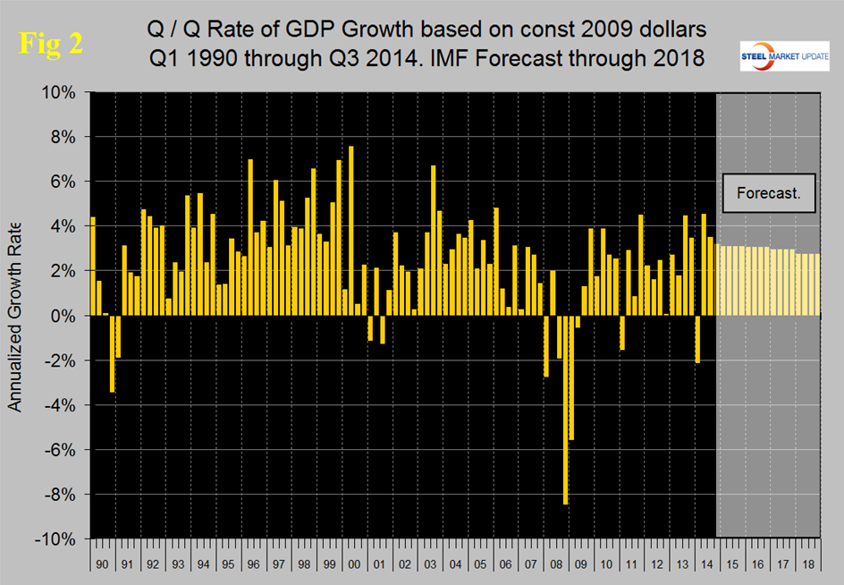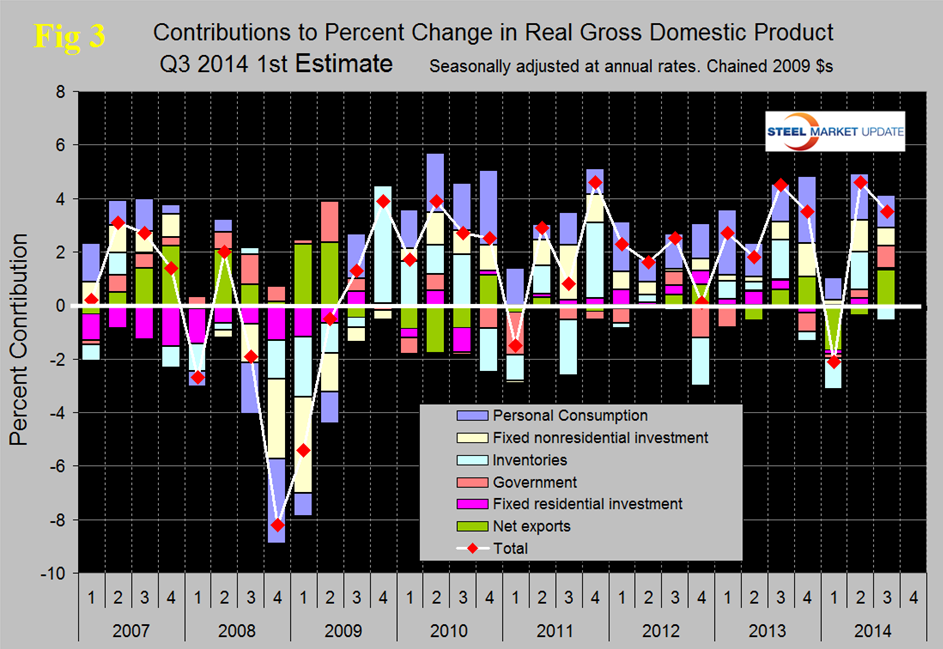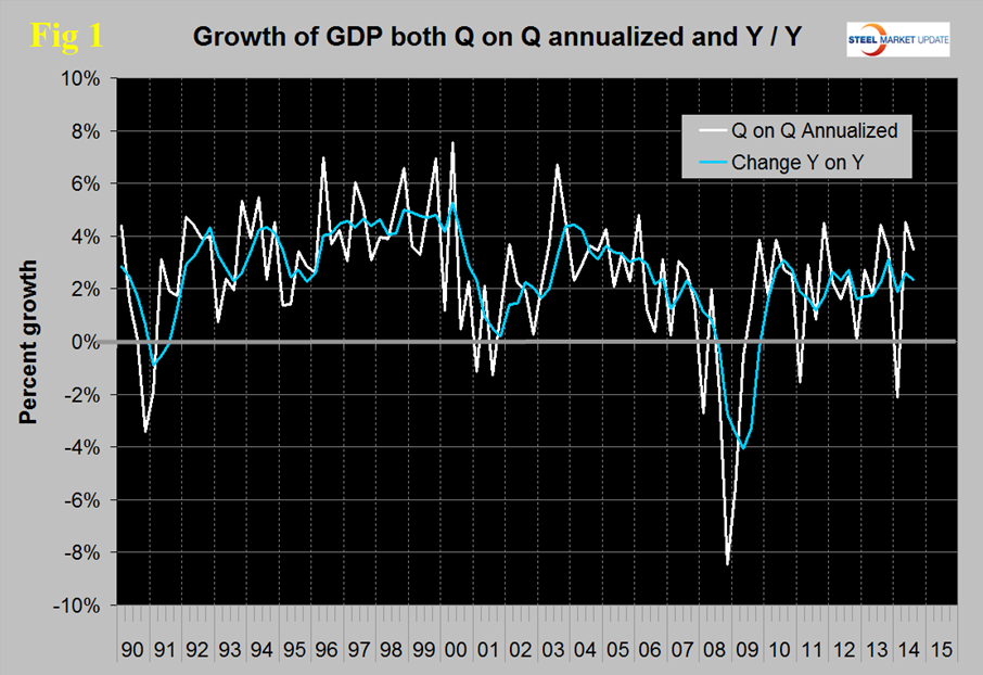 SMU Comment: We have reported frequently in the past on the relationship between GDP and steel consumption. Steel growth follows economic growth but is very much more volatile. In addition over the long run about a 2.5 percent growth of GDP is necessary to get any growth in steel consumption. In four of the last five quarters, GDP growth has been well above 2.5 percent which bodes well for future steel demand.