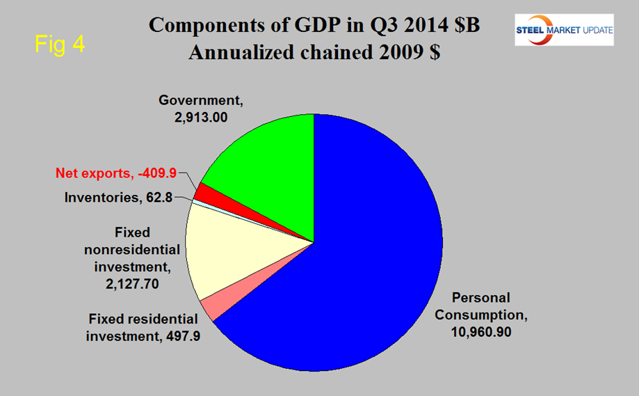 Figure 3 shows the change in the major sub-components of GDP. Comparing Q3 with Q2 there were major changes in the sub-components. Inventories and net exports did an equal and opposite reversal. Net exports changed from slightly negative to strongly positive. Inventories changed from strongly positive to slightly negative. Increasing inventories make a positive contribution to GDP and over the long run inventory changes are a wash and simply move growth from one period to another. Nonresidential construction contracted and government expanded, both more than could be expected on such a short term comparison. Residential construction contracted by $1.7 billion. The contribution of personal consumption shrank from 1.75 percent to 1.22 percent. Personal consumption includes goods and services, the goods portion of which includes both durable and non-durables. In the Q3 personal consumption accounted for 67.9 percent of total economic activity, exactly the same as Q3 last year.