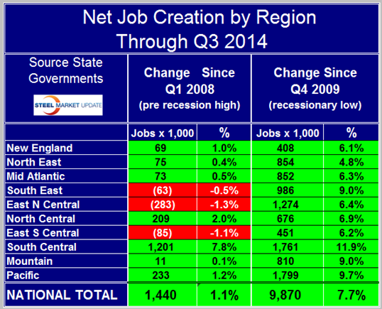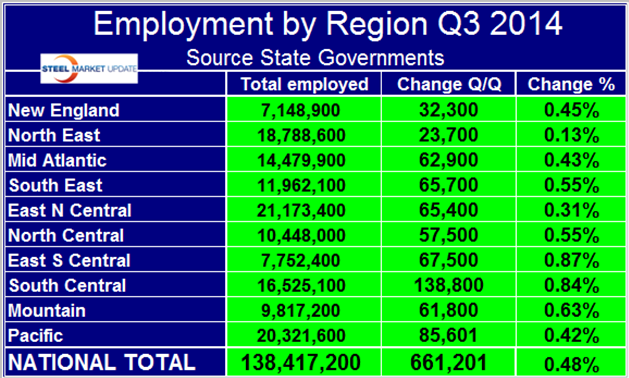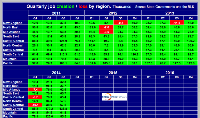 The states compile their employment numbers independently of the Feds then both are reported by the Bureau of Labor Statistics. The results are close with the Feds reporting total job creation in Q3 of 671,000 and the states reporting 661,200. All regions had solid job creation in the 3rd Q led by the South Central with 138,800 new positions, (Table 1).