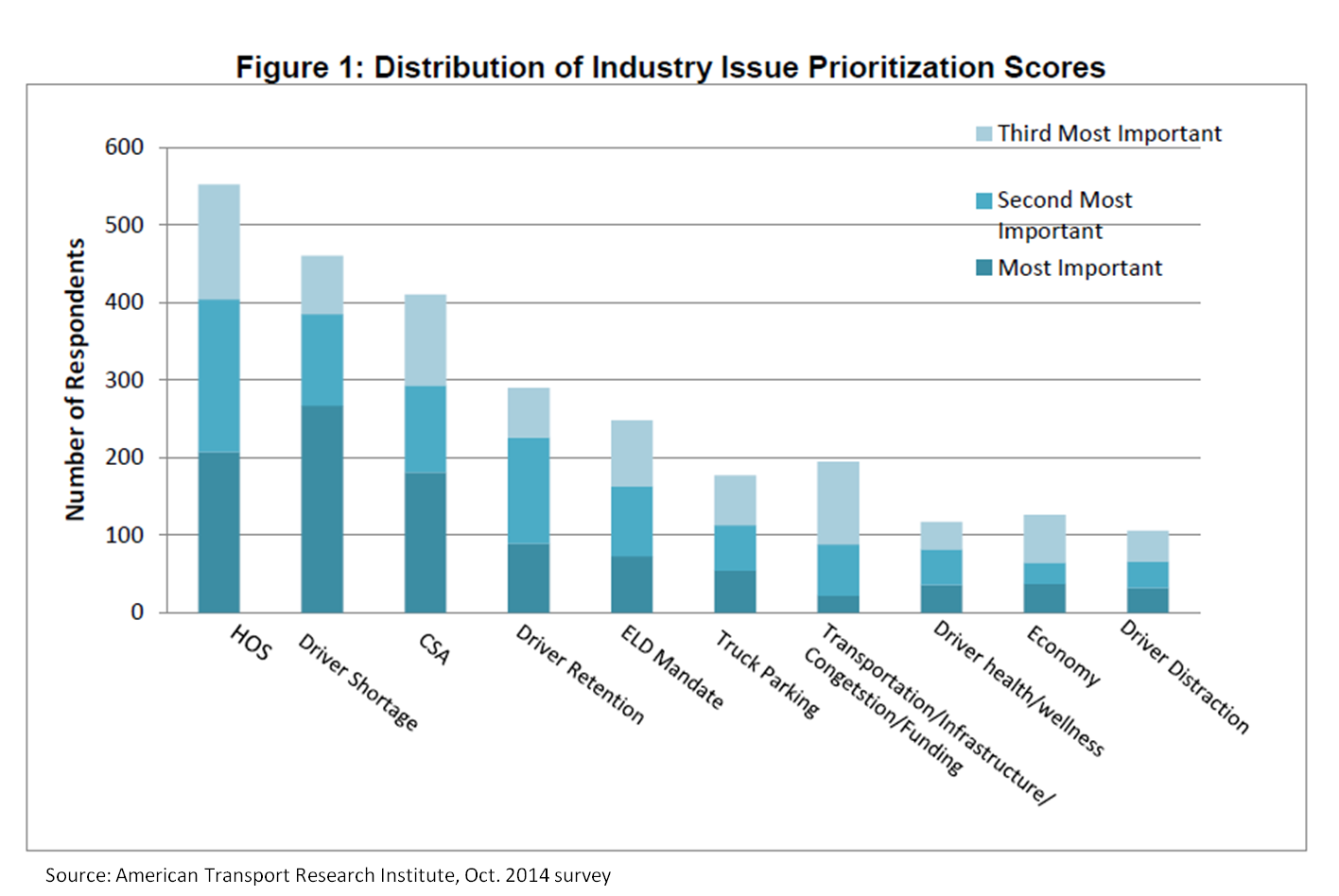The trucking industry’s top concerns were recently highlighted in an October 2014 survey by the American Transportation Research Institute (ATRI). The ATRI report was based on the responses of 1,444 industry drivers, carriers and suppliers. Results show that Hours of Service (HOS) followed by Driver Shortage and Compliance, and Safety and Accountability (CSA) remain the top three issues for the industry.