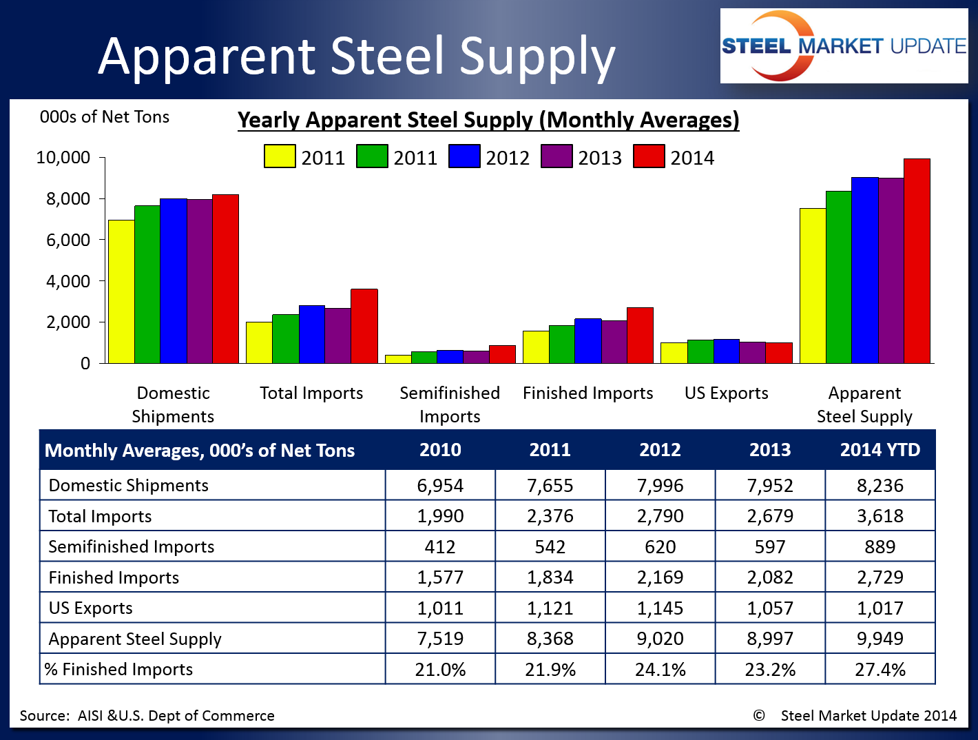 On a year to date basis (YTD), the 2014 averages remain above what we measured during the previous two years, with the exception of total exports. At this time, the U.S. is on pace to exceed 2013 apparent steel supply by approximately 11 percent.