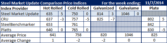 Flat rolled steel prices began to stabilize this past week after having peaked in the middle of August at $675 per ton (hot rolled) and then slowly sliding to a low of $630 per ton during the week ending November 1, 2014. The SMU HRC average actually rose slightly to $635 per ton this past week while CRU dropped $3 to $637 and Platts remained unchanged at $640 per ton. SteelBenchmarker did not report new prices this past week.