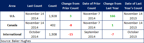 According to Baker Hughes data from November 14th 2014, the U.S rig count for this week is 1,928 rigs exploring for or developing oil or natural gas. This count represents an increase of 3 rigs compared to last week, with oil rigs up 10 to 1,578 rigs, gas rigs down 6 to 350 rigs, and miscellaneous rigs down 1 to 0 rigs. Compared to last year the 1,928 count is an increase of 166 rigs, with oil rigs up by 193, gas rigs down by 20, and miscellaneous rigs down by 7.