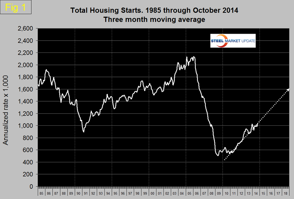 Starts in October fell to an annual rate of 1,009,000 units from 1,038,000 in September. The three month moving average (3MMA) decreased from 1,033,000 units to 1003,000, (Figure 1).