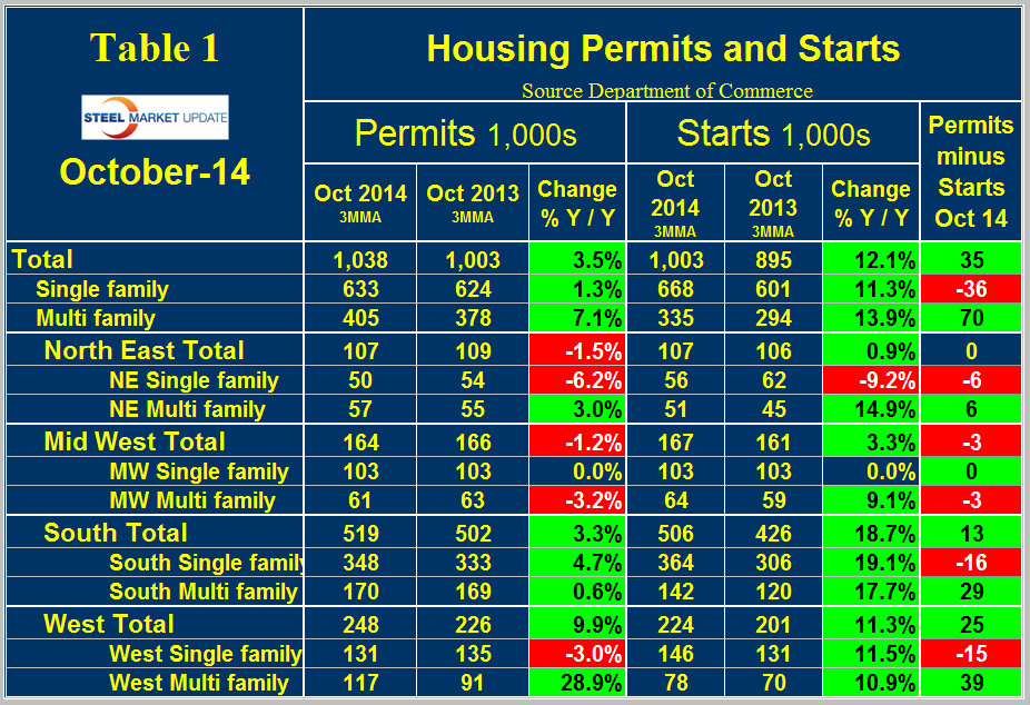 Permit data is useful to evaluate where future starts are headed. If permits exceed starts then we anticipate an acceleration and vice versa. Table 1 shows that total permits did exceeded starts by 35,000 in October on a 3MMA basis. However, the situation is dramatically different for single and multi-family units. Single family permits were 36,000 less than starts and multi-family permits were 70,000 more than starts. This signals a future acceleration in multi-family and a deceleration in single family.