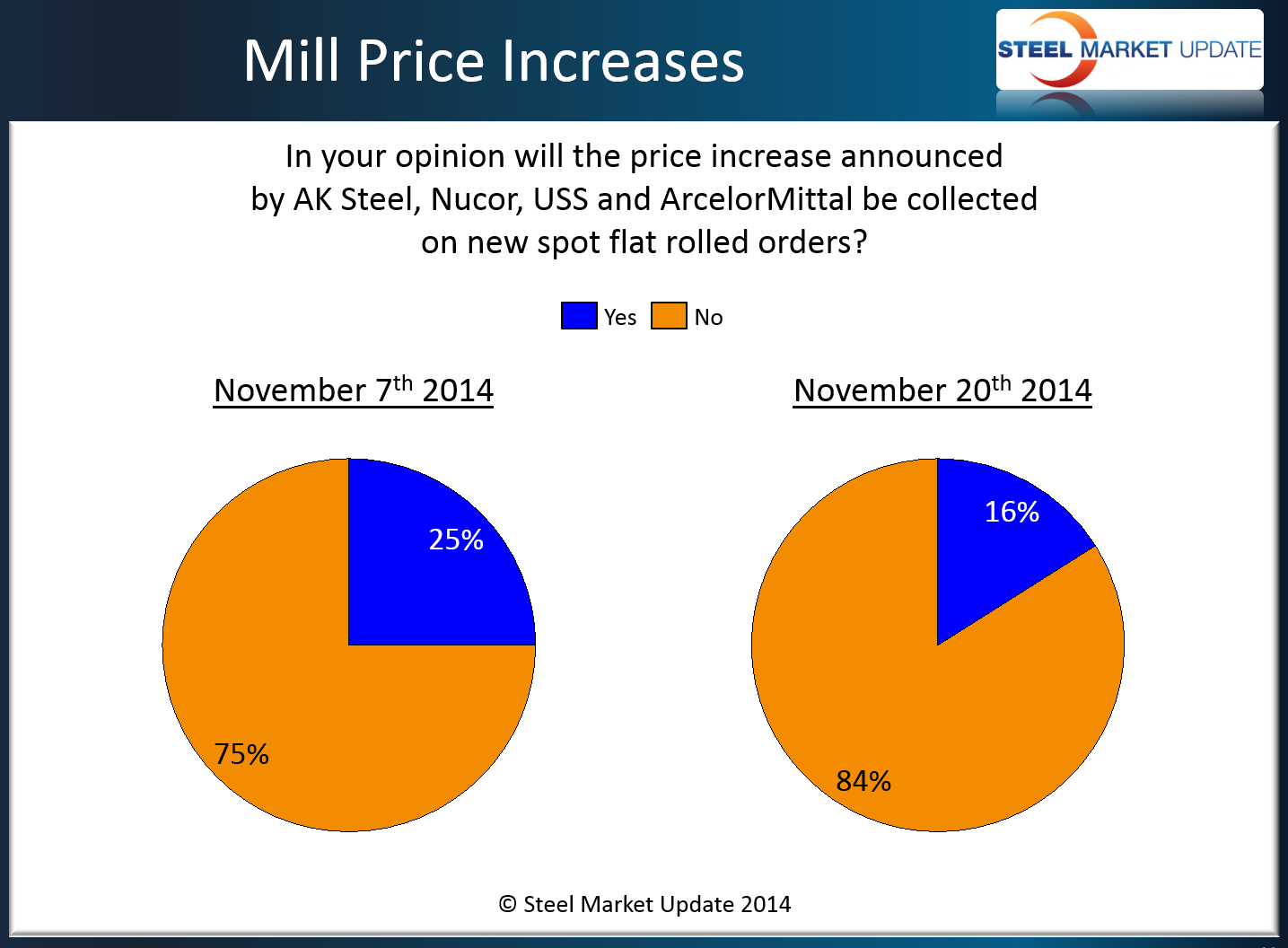 We have been asking buyers and sellers of steel, since the announcements were made, if the domestic mills would be able to collect the price increase. At the beginning of November 75 percent of the respondents to our flat rolled steel market survey responded that the mills would not collect the increase.