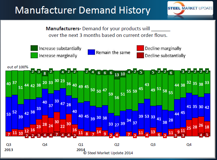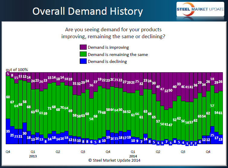 One area we watch carefully is market demand for the products being sold by those involved. Earlier this year we saw our respondents reporting demand as improving. Beginning in late 3rd Quarter and now extending into 4th Quarter we are seeing the percentage of those reporting improving demand as being 15-25 percent lower than what we saw during 2nd Quarter and into early 3rd Quarter 2014.