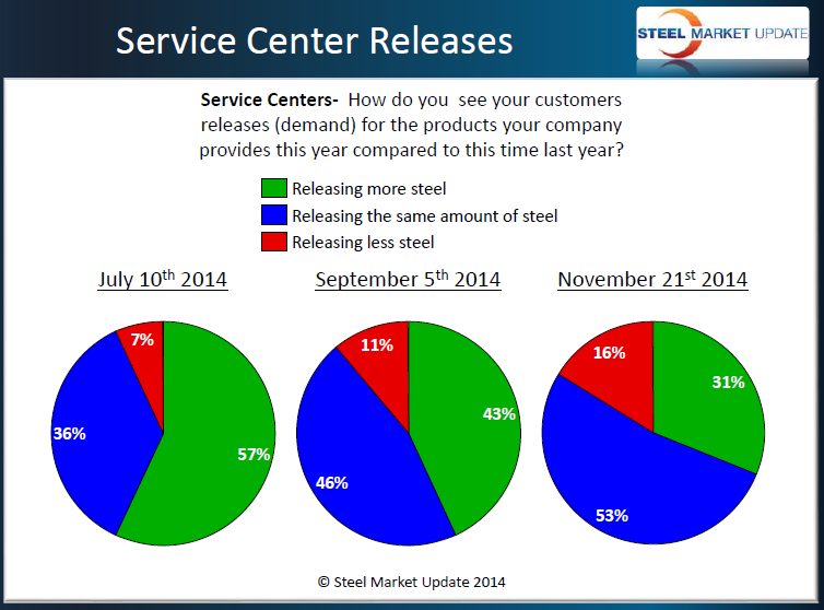 As we begin the process of separating out the various groups we are looking for clarification to see if there is a specific group that is impacting the overall demand numbers more than another. As we look at the service center data we see this market segment as reporting lower demand from their customers. We have broken out three data points: early July, September and now mid-November (see graphic).