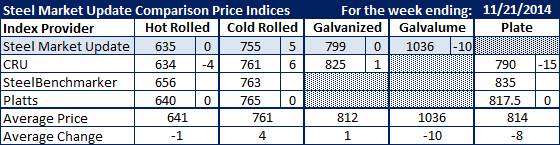 Cold rolled prices actually rose on both SMU and CRU indexes. They are now $755 and $761 respectively. Platts remained at $765 per ton.