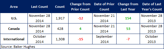 According to Baker Hughes data from November 26th 2014, the U.S rig count for this week is 1,917 rigs exploring for or developing oil or natural gas. This count represents a decrease of 12 rigs compared to last week, with oil rigs down 2 to 1,572 rigs, gas rigs down 11 to 344 rigs, and miscellaneous rigs up 1 to 1 rig. Compared to last year the 1,917 count is an increase of 154 rigs, with oil rigs up by 181, gas rigs down by 23, and miscellaneous rigs down by 4.