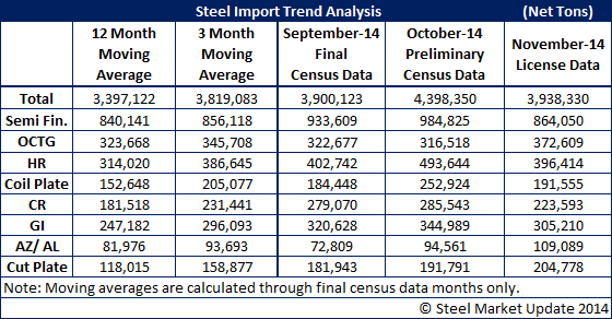 If you are curious and want to look at the November 2013 data and compare it against what we are producing below you can do so by logging into the website and looking under the Analysis tab – Imports/Exports and then Imports History. If you need help finding it – please let us know by email at: info@SteelMarketUpdate.com.