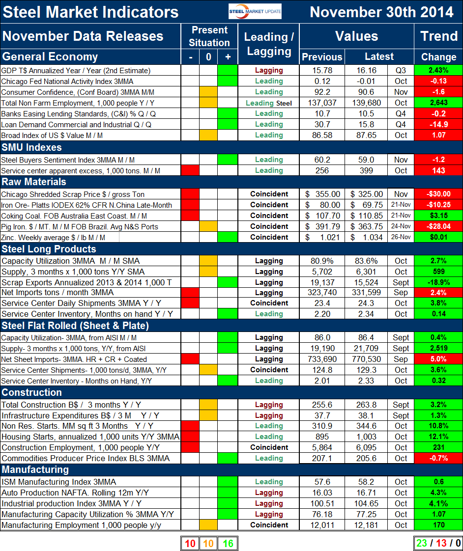 Explanation: The point of this analysis is to give both a quick visual appreciation of the market situation and a detailed description for those who want to dig deeper. It describes where we are now and the direction in which the market is headed and is designed to give a snapshot of the market on a specific date. The chart is stacked vertically to separate the primary indicators of the general economy, of proprietary Steel Market Update indices, of raw material prices, of both flat rolled and long product market indicators and finally of construction and manufacturing indicators. The indicators are classified as leading, coincident or lagging as shown in the third column.