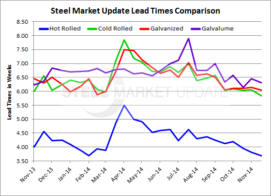 We saw galvanized lead times at 6.50 weeks in mid-September and, like cold rolled, over the next couple of months (4 surveys) GI lead times stabilized at approximately 6.11 months. This week GI lead times fell to 5.97 weeks and are approximately half a week shorter than the 6.30 weeks measured the first week of December 2013.