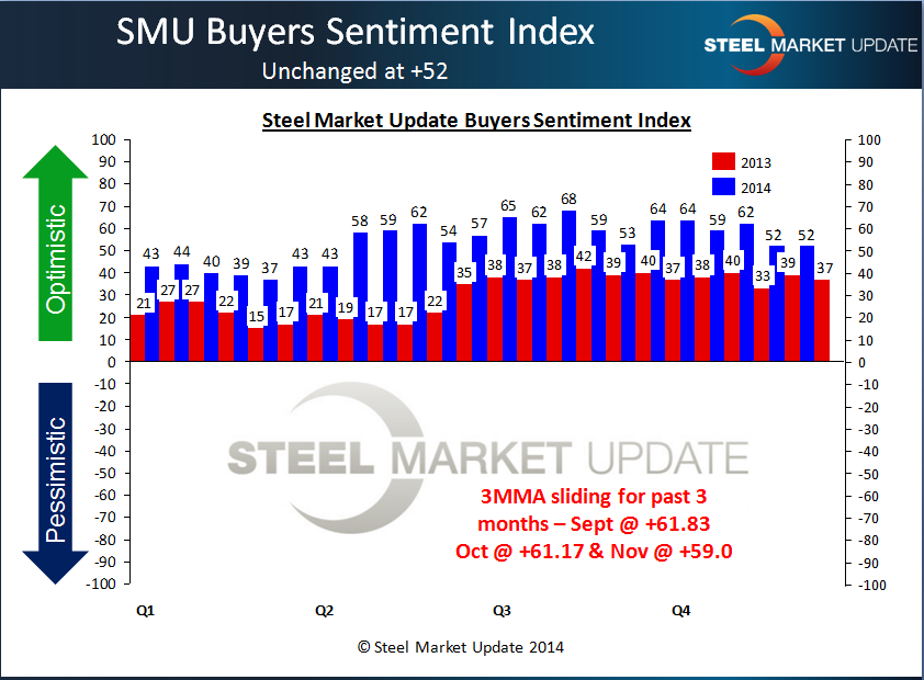SMU Steel Buyers Sentiment Index came in at +52 this week. This is the same reading we got back in the middle of November 2014 The +52, which is within the optimistic range for our index, was 10 points less enthusiastic than what we measured at the beginning of November. One year ago our current index was +39.
