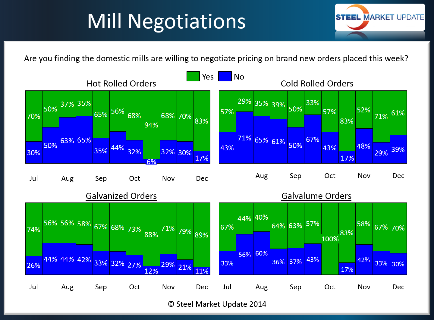 Based strictly on the results from our Steel Market Update flat rolled market survey results, domestic steel mills are willing to negotiate prices on hot rolled, cold rolled, galvanized and Galvalume products. This is something that we see on a regular basis as lead times slip and the need for orders increases at the domestic mills.