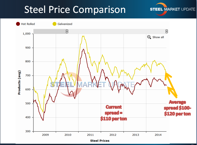 Over the past two years (January 2013 until this week) hot rolled has averaged $641 per ton while galvanized base prices have averaged $751 per ton ($110 per ton spread).