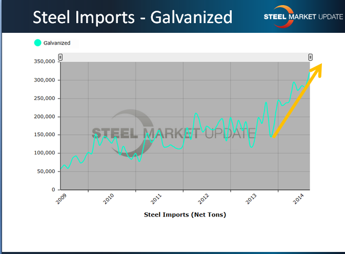 Part of my talk at the 2014 HARDI conference was regarding galvanized imports which reached 325,000 net tons in October and appear will be approximately 300,000 tons when the November Census Data numbers are released later this month. To put this into perspective, at this point last year the U.S. received 150,000 net tons and the average for 2013 was closer to 175,000 tons per month. The 300,000 ton level is quite high when you consider that The Techs three galvanizing lines when running full are about 80,000 tons per month. It takes quite a few galvanizing lines to equal 300,000 tons.
