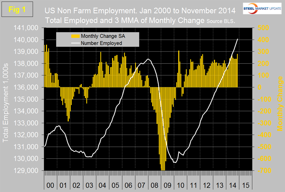 Total non-farm payrolls are now 1,680,000 more than they were at the pre-recession high of January 2008. November was the first time ever for total non-farm employment to exceed 140 million. In each of the last eight months the 3MMA has exceeded 200,000 per month and in the first ten months of 2014 has averaged 227,000. All numbers in this analysis are seasonally adjusted by the BLS.
