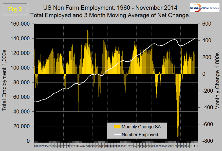 The Bureau of Labor Statistics (BLS) report on non-farm employment indicated that 321,000 jobs were added in November, October and September were revised up by a total of 44,000. The three month moving average (3MMA) of gains was the highest since May 2010 at 278,000. This job recovery is stronger than was the case in the mid-2000s, (Figure 1) and to give a bit more perspective Figure 2 shows results since 1960, it is clear that it is taking longer after each recession for the total employed to recover to the pre-recession high.