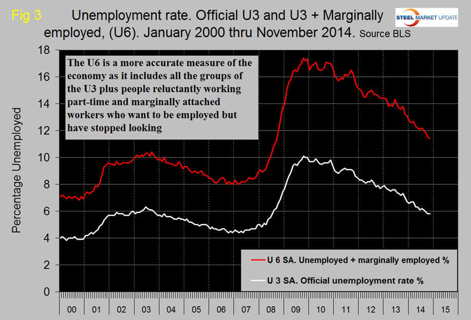 The official unemployment rate was unchanged at 5.8 percent in November and was down 5.9 percent in September and 6.1 percent in August. This is known as the “U3” rate. The more comprehensive U6 unemployment rate stands at 11.4 percent, down from 11.5 percent in October and 11.8 percent in September, (Figure 3). U6 includes workers working part time who desire full time work and people who want to work but are so discouraged that they have stopped looking. The differential between these rates was usually less than 4 percent before the recession but in 2014 has averaged 5.9 percent. The good news is that the gap is closing.