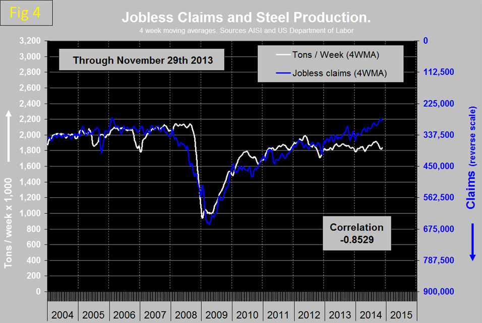 SMU Comment: The November employment report surprised on the upside and is still tracking better than the recovery from the 2001 recession. Which of course it should be since the recessionary losses were much greater in 2008 and 2009. There is an inverse relationship between layoffs and steel production which had a good correlation until early 2013 when the lines began to diverge, (Figure 4). We attribute this to the increasing share being taken by imports. Note this long term relationship is not a cause and effect but simply a benchmark that has historically worked to show if steel production is where it should be given the state of the economy. The other interesting divergence in this graph is just before the recession when the labor, (and housing) market was clearly signaling impending doom eight months before steel demand tanked.
