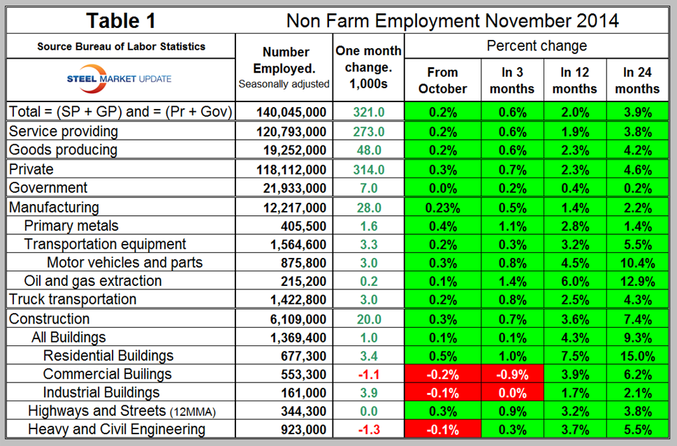 Table 1 slices total employment into service and goods producing industries and then into private and government employees. Total employment equals the sum of private and government employees. It also equals the sum of goods producing and service employees. Most of the goods producing employees work in manufacturing and construction and these sectors are further subdivided in Table 1. In November, private employment grew by 314,000 and government by 7,000. Service industries expanded by 273,000 and goods producing by 48,000 people. Private sector employment has expanded by 4.6 percent in the last 24 months as government by 0.2 percent. Government employment contracted from September 2009 through January this year but has now had ten straight months of growth. Most of the growth in government employment has been at the local level. In the first eleven months of 2014, the federal government has shed 17,000 jobs, state governments have added 16,000 and local governments have added 80,000 positions. This is a recovery process, during the recession most of the government losses were at the local level.