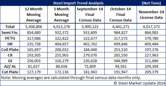 Based on license data (remember our “slop” comment above) November steel imports appear will be close to 4.0 million net tons. This is a little higher than the 3.7-3.8 million tons we had been projecting over the past couple of weeks.