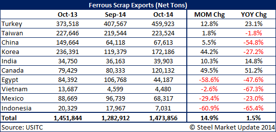 October ferrous scrap exports totaled 1,473,856 net tons (1,337,061 metric tons) with Turkey, Taiwan, Korea, Canada, and Saudi Arabia being the top five countries receiving scrap from the United States. These five countries accounted for 72.4 percent of all scrap exports.