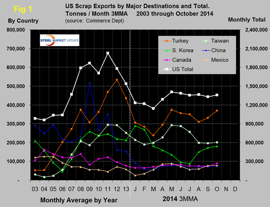 In the first ten months of 2014, scrap exports totaled 12,905,000 metric tons, down by 17.6 percent from the same period in 2013. In the single month of October exports were 1,337,000 tons. Figure 1 shows that the three month moving average has been fairly consistent for the last six months through October and continued to be lower than the average in any year from 2008 through 2013. The most obvious trends so far this year has been that Taiwan and Korea have been almost mirror images of each other. Turkey’s tonnage picked up in September and October in spite of all we read about them preferring Black Sea sources. Year to date Turkey is down by 1.3 million tons or 28.5 percent. China’s tonnage has been quite consistently low this year on a 3MMA basis ranging from 53,000 to 90,000 tons per month. This is compared to over 500,000 tons per month in 2009 when they were the highest volume importer.
