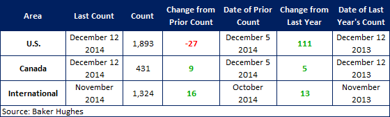 According to Baker Hughes data from December 12th, 2014, the U.S rig count for this week is 1,893 rigs exploring for or developing oil or natural gas. This count is a decrease of 27 rigs when compared to last week, with oil rigs down 29 to 1,546 rigs, gas rigs up 2 to 346 rigs, and miscellaneous rigs unchanged at 1 rig. Compared to last year the 1,893 count is an increase of 111 rigs, with oil rigs up by 135, gas rigs down by 23, and miscellaneous rigs down by 1.
