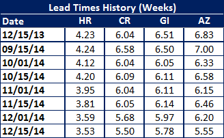 Cold rolled lead times are also shorter than last year at 5.50 weeks vs. 6.04 weeks. Galvanized lead times slipped below 6.0 weeks and now average 5.78 weeks. This is less extended than the 6.51 weeks reported in mid-December 2013. Galvalume lead times also shrunk dropping 0.75 weeks just since the beginning of December 2014. Galvalume is now more than 1 week easier to get in 2014 than what we saw in mid-December 2013.