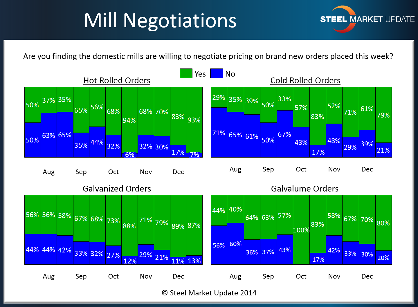 We found 93 percent of the respondents to our survey reporting hot rolled mills as willing to negotiate hot rolled pricing. This is up from 83 percent from two weeks ago.