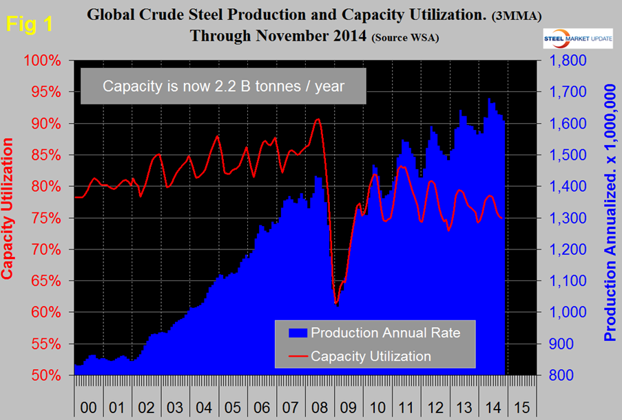 Production in November on a tons per day basis was 4.351 million tonnes, down from 4.411 in October. November had one fewer production day than October and the month’s total decreased from 136.363 million to 130.525 tons. Since January 2008 on average, November monthly production has decreased by 5.36 percent, this year November decreased by 4.28 from October. The three month moving average (3MMA) of production in November on an annualized basis was 1.607 billion tonnes and a capacity utilization of 74.3 percent, (Figure 1).