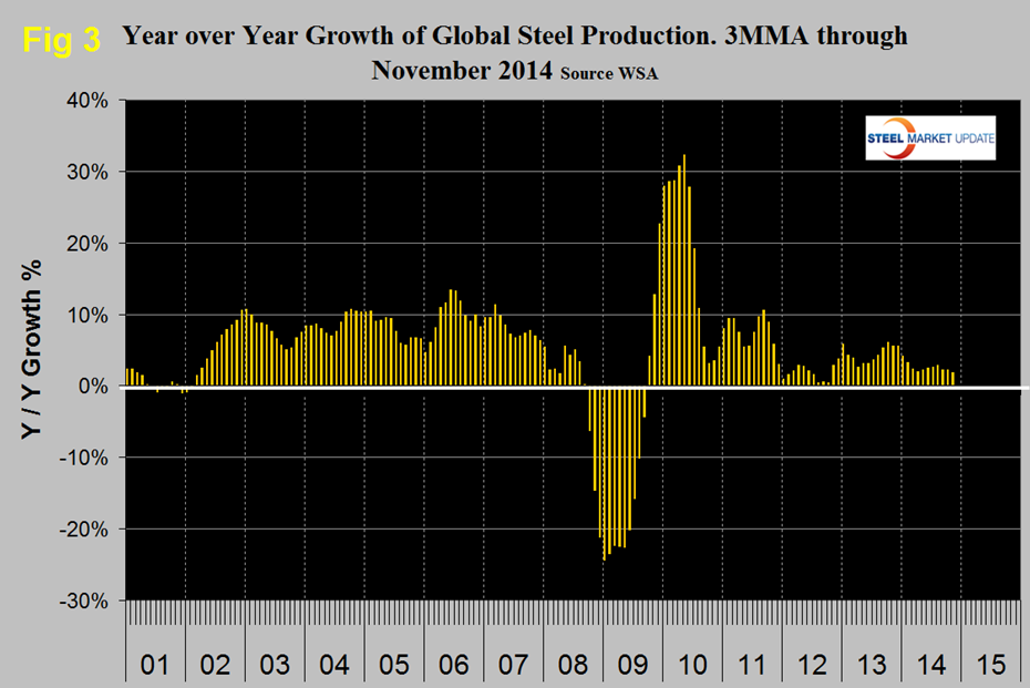In three months through November, y/y global growth declined to exactly zero. Year to date growth through November was 1.6 percent, since the 3 month growth is less than the 11 month YTD growth it means that production is slowing. This is not a seasonal effect as our comparison is year over year. Asia which previously was the growth engine slowed to 0.7 percent in three months through November. South Korea grew at a 6.5 percent rate down from 9.5 percent in last month’s analysis. China’s growth was negative 0.2 percent in three months through November y/y. Japan had a negative 1.1 percent growth. China’s growth rate has stalled as a result of lower domestic demand their exports are now at an all-time high. The EU, CIS and other Europe had negative y/y growth in three months through November. North and South America had positive growth. The effect of the war in Ukraine is clear in the contraction of that country’s steel production. The European Union which had the fastest growth rate in early 2014 continued to slow and contracted at 0.5 percent in three months through November, Germany contracted by 3.6 percent. Year over year growth of output in the NAFTA was 1.5 percent in three months through November with the US at 0.7 percent. South America had positive 0.7 percent growth through November with its largest producer, Brazil also up by 0.7 percent. In November China’s share of total global production stayed below 50 percent at 49.4 percent and North America’s was 7.5 percent. Figure 3 shows that the 3MMA of the monthly global production y/y which steadily increased from 2.0 percent in April to 2.8 percent in August, fell to 2.2 percent in September, stayed at 2.2 percent in October and declined again to 1.8 percent in November. It seems undeniable now that the growth of global steel production is slowing and along with the price of oil and the Baltic Dry Index is indicative of a slowing global economy.