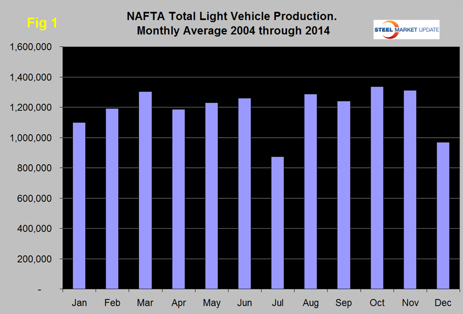 November was a strong month for light vehicle sales rising to 17.2 million units, (annualized) from 16.5 million in October. This was the best result since August. So far in 2014 sales are averaging 16.45 million units, the best rate since 2006. Light trucks increased faster than automobiles in November presumably boosted by low gas prices. Trucks increased from 8.5 million to 9.0 million, cars from 8.0 million units to 8.2 million. Light trucks accounted for 52.5 percent of total sales, compared with 52.1 percent year to date. Chrysler is doing particularly well being up by 21 percent over the past 12 months. Its market share, at 13 percent, is the highest since 2007. Ford, which is starting up its aluminum intensive F150 line in Dearborn was down 1.7 percent over the year through November. The market share of imported vehicles was only 20.5 percent in November and has been falling steadily since early 2009.