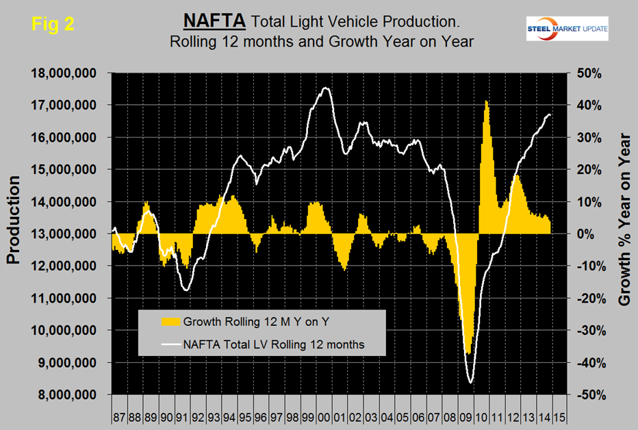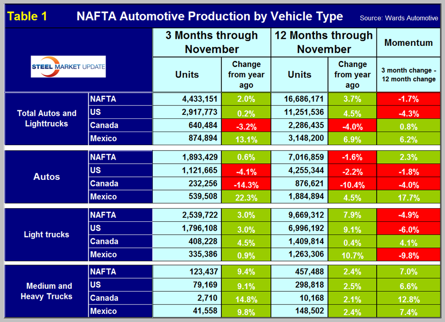 Growth has slowed for four straight months through November on a rolling 12 months basis. On this basis the US is up by 4.5 percent, Canada is down by 4.0 percent and Mexico is up by 6.9 percent, (Table 1). For NAFTA as a whole on a rolling 12 month basis year over year, light truck production is up by 7.9 percent and autos are down by 1.6 percent. Ford began the initial phase of deliveries of the aluminum intensive F150 this month. The plan to be at full production in Dearborn by the end of December. The company spent an estimated $350 million to re-tool including four press lines to stamp four grades of high strength aluminum sheet and installing new lines to hydroform support rails.
