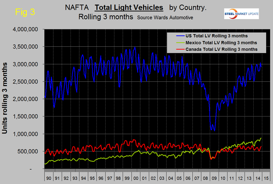 To put the production of the three NAFTA countries into perspective, US output of total light vehicles in Q3 was 5.3 times that of Canada and 3.6 times that of Mexico, (Figure 3).