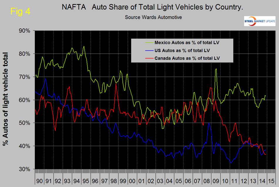 The mix of light vehicles is very different by country, (Figure 4). The percentage of autos in the Mexican mix is over 60 percent but only 38.4 in the US and 36.3 percent in Canada.