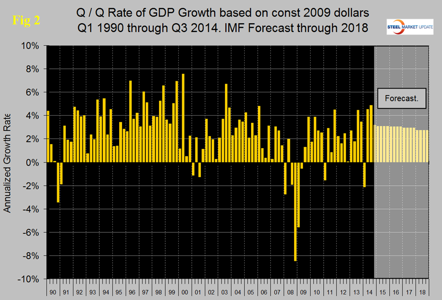 Figure 2 shows the publicized quarterly results since 1990 and the latest IMF forecast through 2018. The reported GDP growth in the 2nd and 3rd quarters were the best back to back results since 2003. Based on the strong Q2 result, the IMF increased its forecast for the US in the October World Economic Outlook report, no doubt there will be another upward revision in the April 1025 WEO report.