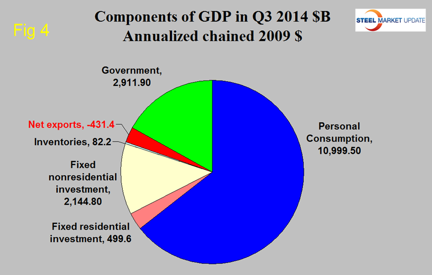 Comparing Q3 with Q2 there were major changes in the sub-components. Personal consumption and fixed residential investment were both up by 3.2 percent. Personal consumption includes goods and services, the goods portion of which includes both durable and non-durables. In the 3rd Q personal consumption accounted for 67.9 percent of total economic activity, exactly the same as Q3 last year. Fixed nonresidential grew by 8.9 percent, durable goods grew by 9.2 percent and government grew by 4.4 percent. Inventories which had contributed 1.42 percent to the 2nd Q result contributed only 0.03 percent in Q3. Increasing inventories make a positive contribution to GDP and over the long run inventory changes are a wash and simply move growth from one period to another. Net exports which had a negative contribution of 0.34 percent in Q2 made a positive contribution of 0.78 percent in Q3. Figure 4 shows the breakdown of the $16 trillion economy.