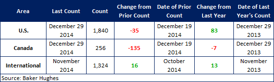According to Baker Hughes data from December 29th, 2014, the U.S rig count for this week is 1,840 rigs exploring for or developing oil or natural gas. This count is a decrease of 35 rigs when compared to last week, with oil rigs down 37 to 1,499 rigs, gas rigs up 2 to 340 rigs, and miscellaneous rigs unchanged at 1 rig. Compared to last year the 1,840 count is an increase of 83 rigs, with oil rigs up by 117, gas rigs down by 34, and miscellaneous rigs unchanged.