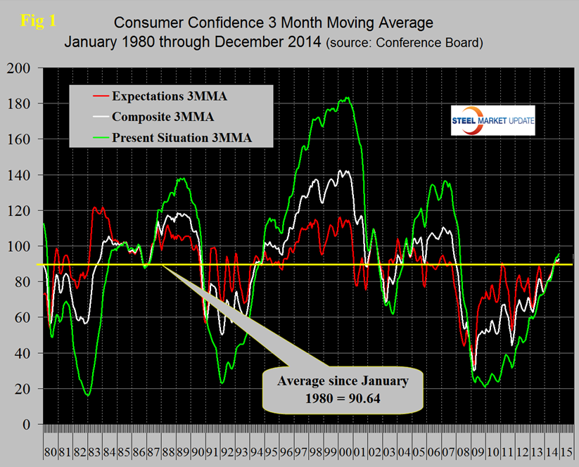 The Consumer Confidence Index as reported by the Conference Board rose in December and the November results were revised upwards. The composite rose from 91.0 to 92.6, the view of the present situation rose from 93.7 to 98.6 as expectations fell from 89.3 to 88.5. The three month moving averages (3MMA) of the composite and present view and expectations all improved. The 3MMA of the composite at 92.6 is now higher than the 35 year average since 1980 which stands at 90.6, the 3MMA of the composite, the view of the present situation and expectations are shown in Figure 1.