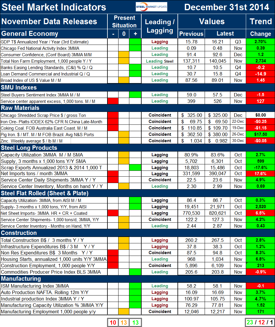 Explanation: The point of this analysis is to give both a quick visual appreciation of the market situation and a detailed description for those who want to dig deeper. It describes where we are now and the direction in which the market is headed and is designed to give a snapshot of the market on a specific date. The chart is stacked vertically to separate the primary indicators of the general economy, of proprietary Steel Market Update indices, of raw material prices, of both flat rolled and long product market indicators and finally of construction and manufacturing indicators. The indicators are classified as leading, coincident or lagging as shown in the third column.