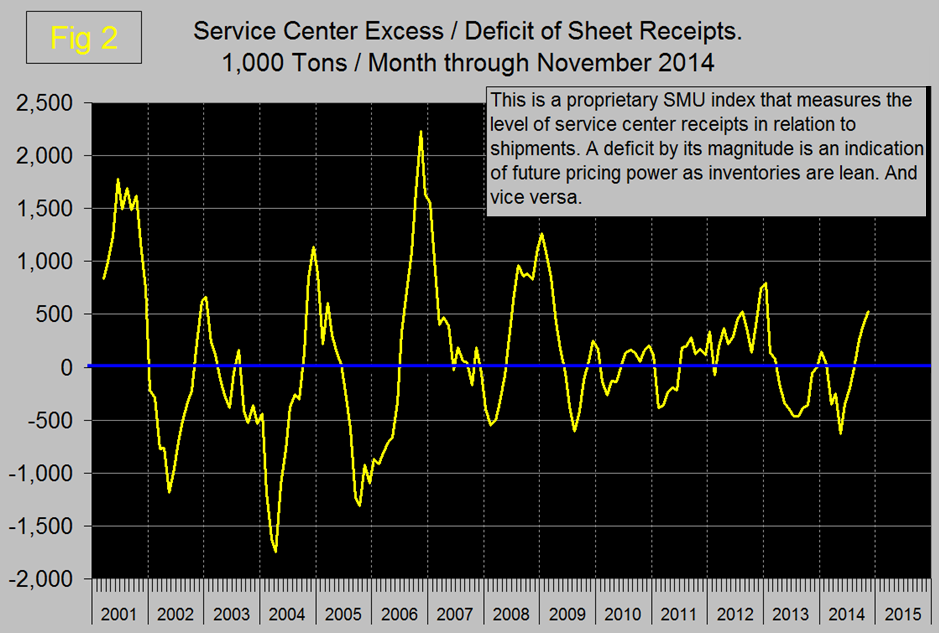 The trends of both of the SMU proprietary indexes continued to be negative. The sentiment index was down from 62.3 on November 1st as described above but is still historically strong. The service center excess rose from 399,000 tons in October to 526,000 tons in November. This indicator was developed by SMU for sheet products and when in surplus indicates rising inventories and falling pricing power. SMU is forecasting an excess through March next year, this includes import material sitting on the docks.