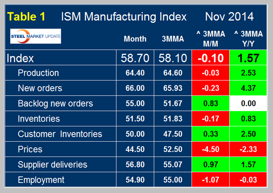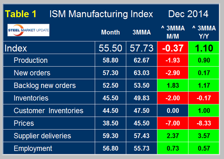 The report was issued today by Bradley J. Holcomb, CPSM, CPSD, chair of the Institute for Supply Management® (ISM®) Manufacturing Business Survey Committee. “The December PMI registered 55.5 percent, a decrease of 3.2 percentage points from November’s reading of 58.7 percent. The New Orders Index registered 57.3 percent, a decrease of 8.7 percentage points from the reading of 66 percent in November. The Production Index registered 58.8 percent, 5.6 percentage points below the November reading of 64.4 percent. The Employment Index registered 56.8 percent, an increase of 1.9 percentage points above the November reading of 54.9 percent. Inventories of raw materials registered 45.5 percent, a decrease of 6 percentage points from the November reading of 51.5 percent. The Prices Index registered 38.5 percent, down 6 percentage points from the November reading of 44.5 percent, indicating lower raw materials prices in December relative to November. Comments from the panel are mixed, with some indicating that falling oil prices have an upside while others indicate a downside. Other comments mention the negative impact on imported materials shipment due to the West Coast dock slowdown.”