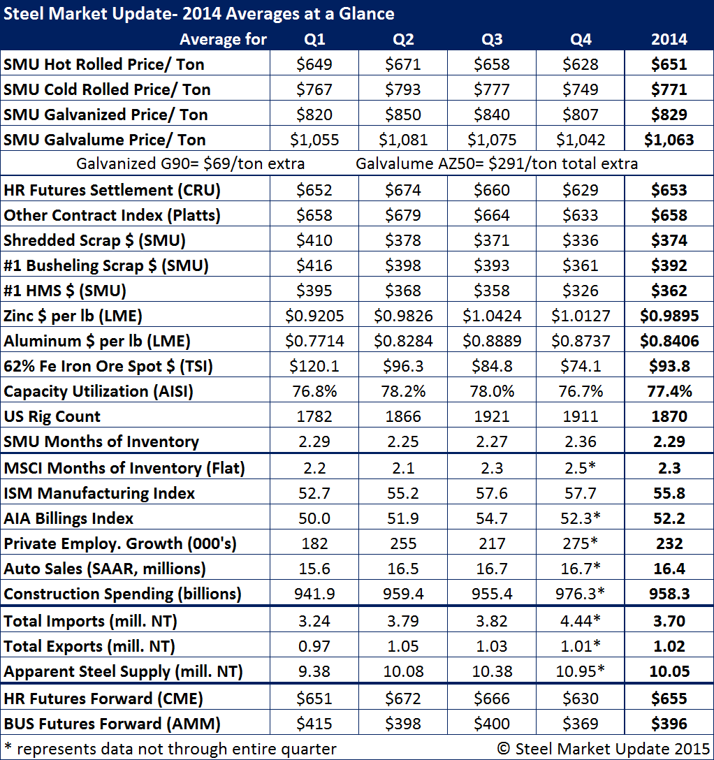 The keys for 2015 will be: controlling service center inventories, controlling foreign steel imports, oil and natural gas prices and their impact on the energy markets (especially drilling as represented by rig counts) and iron ore spot prices which at the moment have flattened out around $70 per dry metric ton on 62% Fe fines. Iron ore and oil prices are forecast to stay down during this year providing there is no “Black Swan” event.