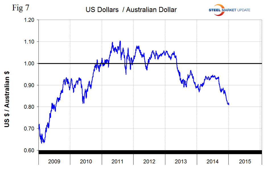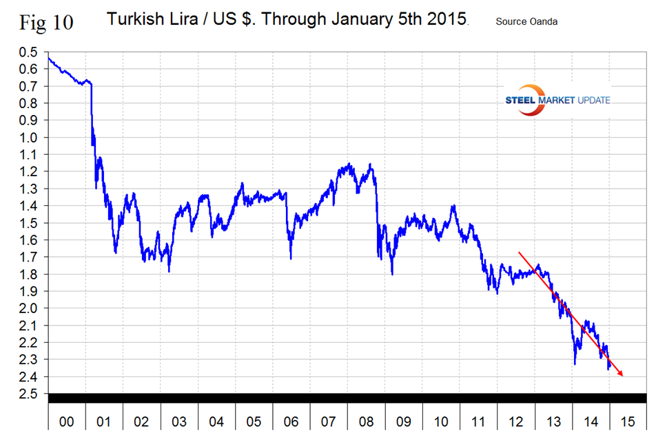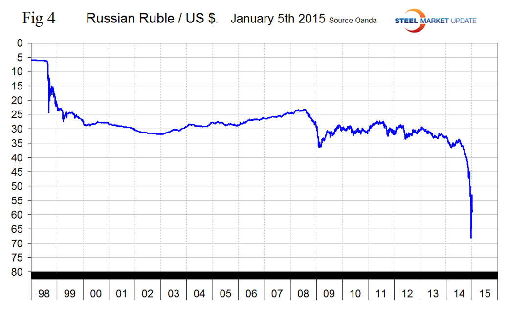 The Russian Ruble has had the largest decline of all the steel trading nations in the last three months, one month and seven days and is in virtual free fall, (Figure 4). Multiple interest rate increases have so far had no effect on the rate of decline. These moves are intended to bolster the currency that has been hurt both by sanctions and by the drop in the price of oil which is Russia’s major export and income earner. Worth Wray, “Those of us who watch the US dollar were not surprised by the collapse in oil prices, because the dollar’s surge was already telling us something about global demand. What did surprise a lot of economists (myself included) was the breakdown within OPEC, particularly Saudi Arabia’s willingness to accept whatever price the market offered in order to protect its market share. Conspiracy theories aside as to whether OPEC’s move constitutes an anti-American trade war against US shale producers or a pro-American squeeze on Russia, Iran, and Venezuela, it’s already putting a serious squeeze on Texas oil men, Russian “oligarchs,” and oil-exporting emerging markets.”