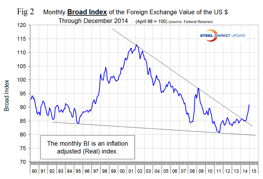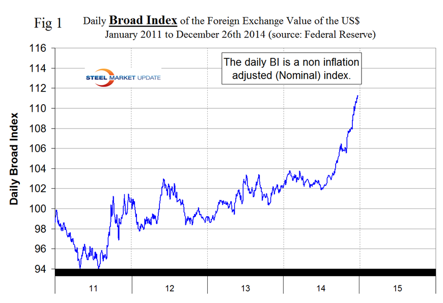 The value of the U.S. dollar is having a major impact on commodity, scrap and steel pricing. The strengthening of the dollar is something that Steel Market Update is watching very closely. We are therefor going to increase the number of times we provide currency updates from once per month to every three weeks (and maybe two weeks if necessary) in order to keep our readers abreast of the changes. The following article is written by contributing writer, consultant and Steel 101 instructor – Peter Wright.